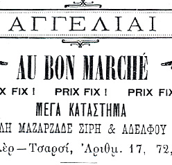 Εγκαινιάζεται το εμπορικό κατάστημα πώλησης υφασμάτων “Bon Marché”, το πρώτο κτίριο με μορφολογικά στοιχεία νεοκλασικής και βαλκανικής αρχιτεκτονικής. Το κτίριο σώζεται μέχρι σήμερα (οδός Αγ. Μηνά).