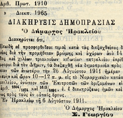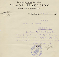 Ηλεκτροφωτίζονται για πρώτη φορά οι δρόμοι του Ηρακλείου στις 25 Δεκεμβρίου. Τη διανομή του ρεύματος αναλαμβάνει η συσταθείσα «Ηλεκτρική Υπηρεσία» του Δήμου Ηρακλείου με διευθυντή το Νικόλαο Ξ. Λήμνιο.